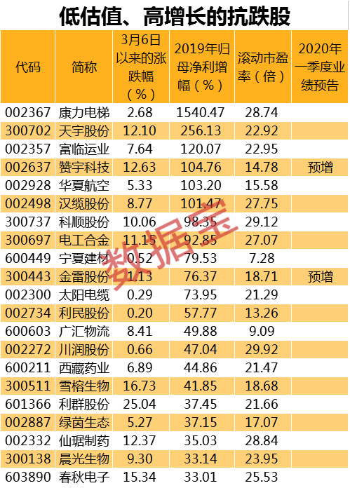 疫情期间,抗跌股显示了对抗市场风险的能力,如果其基本面数据良好,比如低估值、业绩高增长,就非常值得关注。