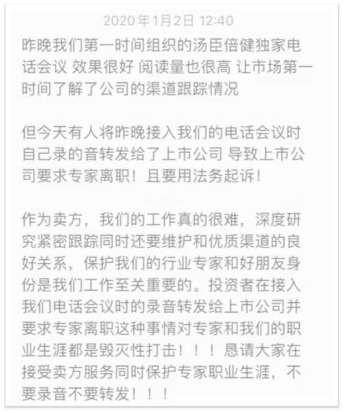 不过对于这次突发利空,机构和上市公司仍旧不敢掉以轻心。金融界获悉,东W证券1月1日晚间火线组织了关于汤臣倍健的电话会议,邀请了“药店渠道经销商李总”做分享,内容中不乏未公开“内幕”,却被券商客户录音后转发给汤臣倍健,据称上市公司“要求专家离职!且要用法务起诉!”