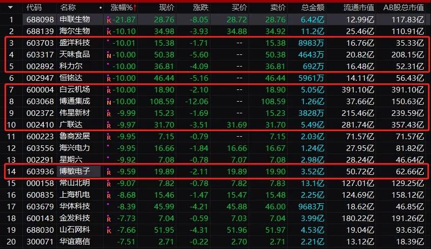 除了白云机场广联达伟星新材市值靠前的白马股跌停外,天味食品、博通集成、科力尔、博敏电子、盛洋科技等今天也在三季报披露后跌停或盘中跌停。