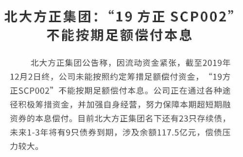 昨日,北大方正集团公告称,北大方正集团公告称,因流动资金紧张,截至2019年12月2日终,公司未能按照约定筹措足额偿付资金,“19方正SCP002”不能按期足额偿付本息。公司正在通过各种途径积极筹措资金,并加强自身经营,努力保障本期超短期融资券的本息偿付。