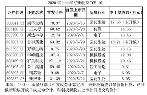 根据数据,截至2020年7月9日,今年沪深两市共有129只新股上市。据小编统计,今年上半年单签收益超10万元的新股就有7只。