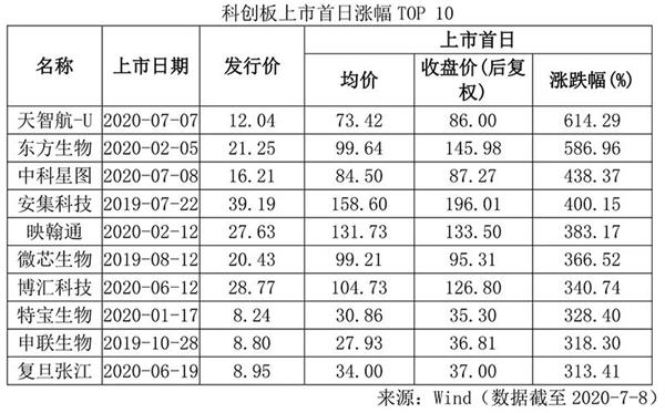 市场火爆下,科创板新股上市后首日涨幅也明显扩大。截至7月8日,共有4只科创板新股在上市首日的涨幅超过400%,而本周上市的就占到其中2只,分别是周二、周三上市的天智航及中科星图。