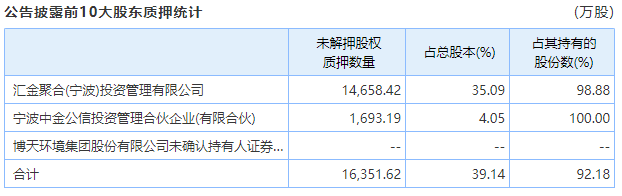 游资丧气,散户生气,控股股东见了估计也要郁闷。目前,博天环境控股股东汇金聚合和其一致行动人中金公信持有的公司股份超过92%已进行了质押。10月18日晚间,博天环境公告称,中金公信日前将其持有的全部公司股份解除质押后进行了再质押。