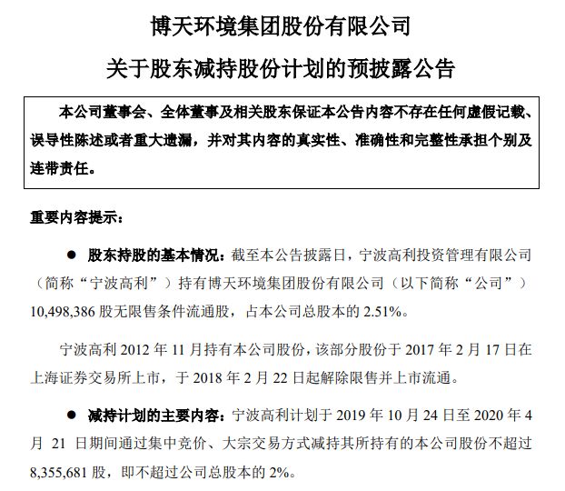 10月18日晚间,博天环境公告称,持有公司总股本2.51%的股东宁波高利拟在2019年10月24日至2020年4月21日之间,通过集中竞价交易、大宗减持的方式减持不超过835.57万股的公司股份,即不超过公司总股本2%的公司股份。