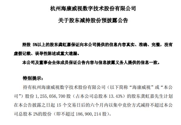 海康威视还面临股东减持的问题。海康威视5月23日发布公告表示,持公司13.43%的股东龚虹嘉计划在公告日起15个交易日后的六个月内,以集中竞价方式减持不超过公司总股本2%的股份(即不超过1.87亿股)。