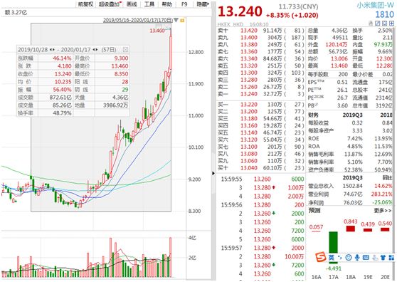 中泰国际(香港)分析师颜招骏向时报君分析称,小米近期股价暴涨配合了多个因素,首先,小米在中国5G商用牌照发布三个月后便推出中国市场第一款5G手机,并于12月发布售价1999元人民币的5G手机Redmi K30,将5G手机的售价降至2000元人民币以下,打破了市场规律。另一方面,公司预计今年在中国推出10款5G智能手机,推机速度较2019年进取,加速了5G渗透率的提升。公司在IoT平台连接设备数目保持高速增长,随着5G渗透率的上升,有助完善IoT生态及吸引更多用户,释放变现能力。
