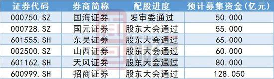 今年以来,已有6家券商发布了配股预案,拟募集资金总额为438.05亿元。