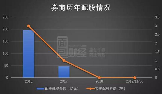 数据显示,2016年共有3家券商实施配股,实际融资金额为197.22亿元,2017年仅西部证券1家券商实施了配股融资,实际融资金额47.61亿元,较2016年下降超七成。然而,2018年至2019年11月末,成功实施配股融资的券商家数为零。