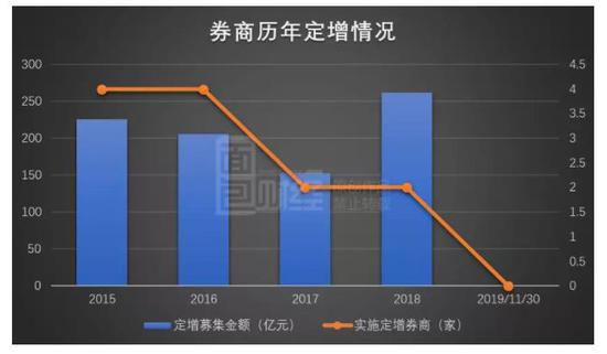 2019年上市券商通过定增方式落实的再融资较此前大幅缩减。