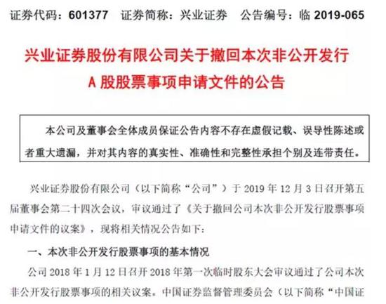 兴业证券日前发布公告称,公司撤回非公开发行A股股票事项申请文件。