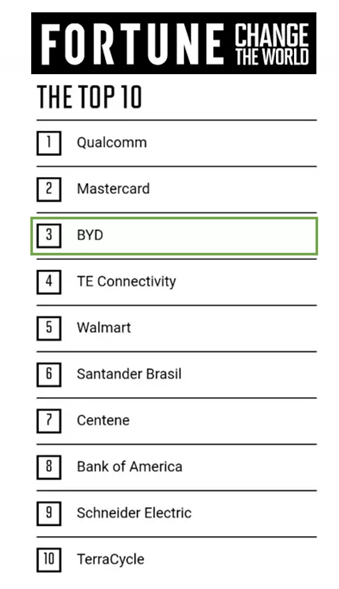 日前,《财富》杂志发布了“改变世界的企业”(Change the World)榜单,列出了52家通过经营活动改变世界的52家企业。其中,中国汽车厂商比亚迪因扩大电动汽车市场排在第三位。