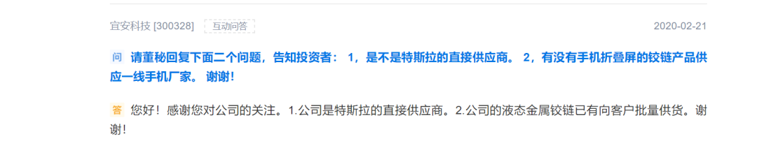 2月8日,公司表示属于特斯拉一级供应商;2月13日,公司表示与特斯拉有直接合作关系,特斯拉国产化后将有利于公司新能源汽车业务的拓展,是公司发展的契机;2月21日,公司表示特斯拉是公司新能源汽车产品重要客户之一以及公司液态金属应用在折叠手机铰链上;