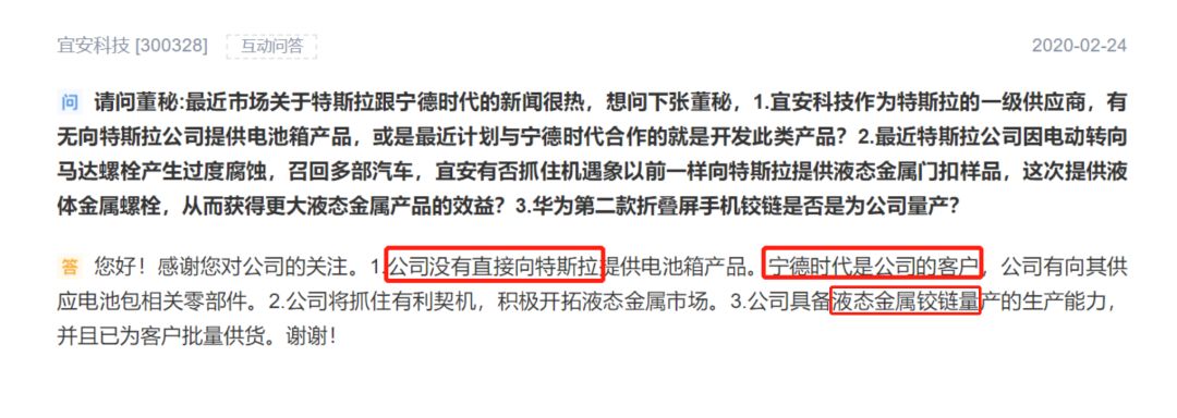 深交所关注到,2020年2月以来,宜安科技在互动易上答复投资者时多次涉及特斯拉、新能源汽车、折叠手机铰链等市场关注度较高的事项。