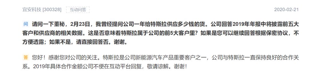比如,一名投资者近期在互动易上提问公司一年给特斯拉供应多少钱的货。公司的回复是:特斯拉是公司新能源汽车产品重要客户之一……2019年具体合作金额公司不便在互动平台回复。