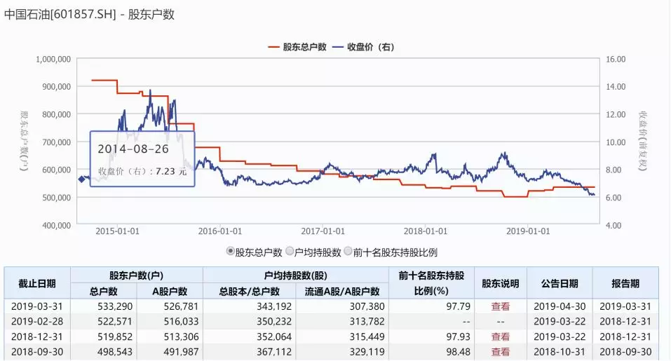 股价的惨烈表现,让数百万股民选择退出这场耗时已久的博弈之中。数据显示,中国石油最巅峰时期拥有213万户股民,而到了2019年第一季度末,中石油还剩有53.33万户。