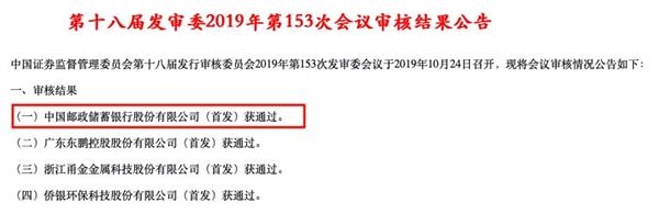 10月24日,中国邮政储蓄银行股份有限公司通过发审委审核。