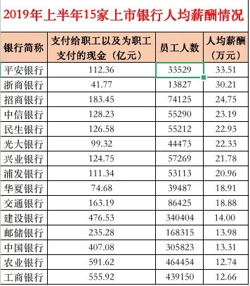在员工人均薪酬方面,与上市股份行相比,国有行均处于较低水平。其中,邮储银行员工上半年人均薪酬为13.98万元,月均2.33万元。在六大国有行中处于中上游水平。
