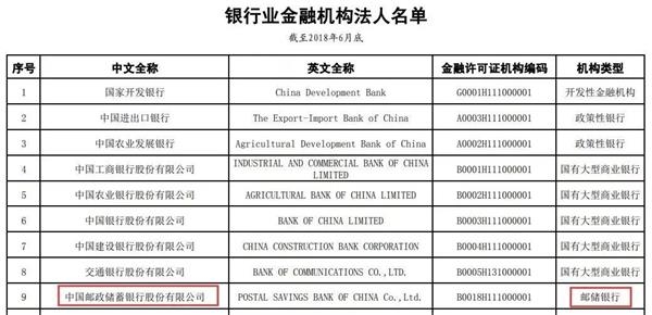 2月15日,银保监会官网信息显示,将邮储银行的机构类型列为“国有大型商业银行”,与工、农、中、建、交并列,中国国有商业银行扩容为6家。
