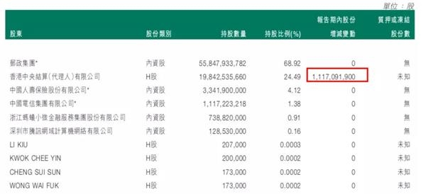 上半年香港中央结算增持邮储银行11.17亿股,持股比例增至24.49%,跃升至第二大股东。