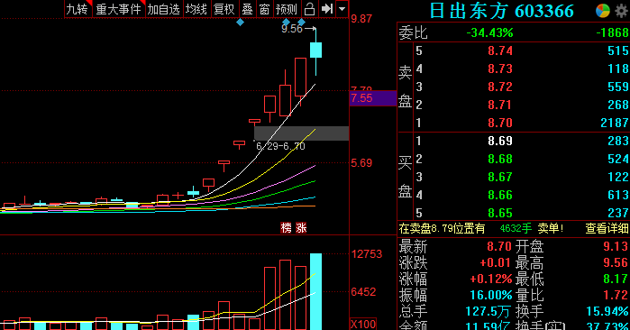 12月30日至今,日出东方在短短8个交易日内斩获7个涨停板,累计涨幅达102%。