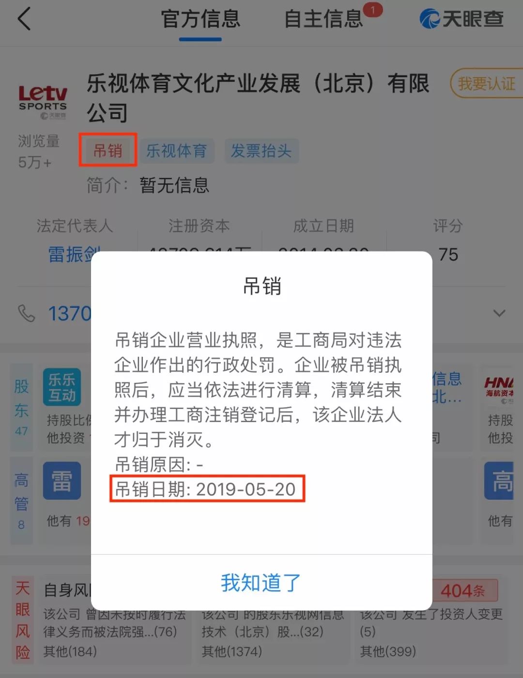 近日天眼查信息显示,乐视体育文化产业发展(北京)有限公司的工商信息发生了变更,公司的经营状态已由“在业”变为“吊销”,吊销时间为2019年5月20日。