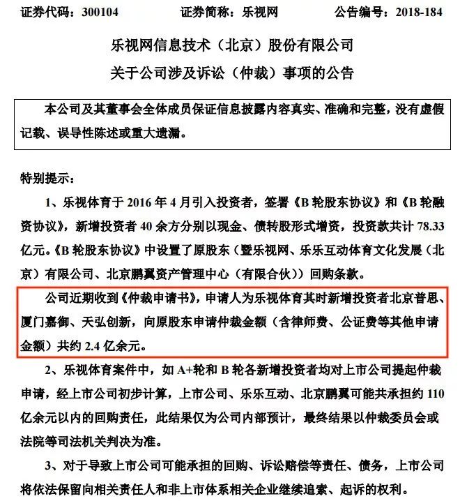 去年11月,乐视网发布公司涉及诉讼的公告称,近期收到《仲裁申请书》,申请人为乐视体育B轮融资时引入的投资者北京普思、厦门嘉御、天弘创新,上述申请人向乐视体育原股东(包括乐视网、乐乐互动及北京鹏翼资产)申请仲裁金额共约2.4亿余元。