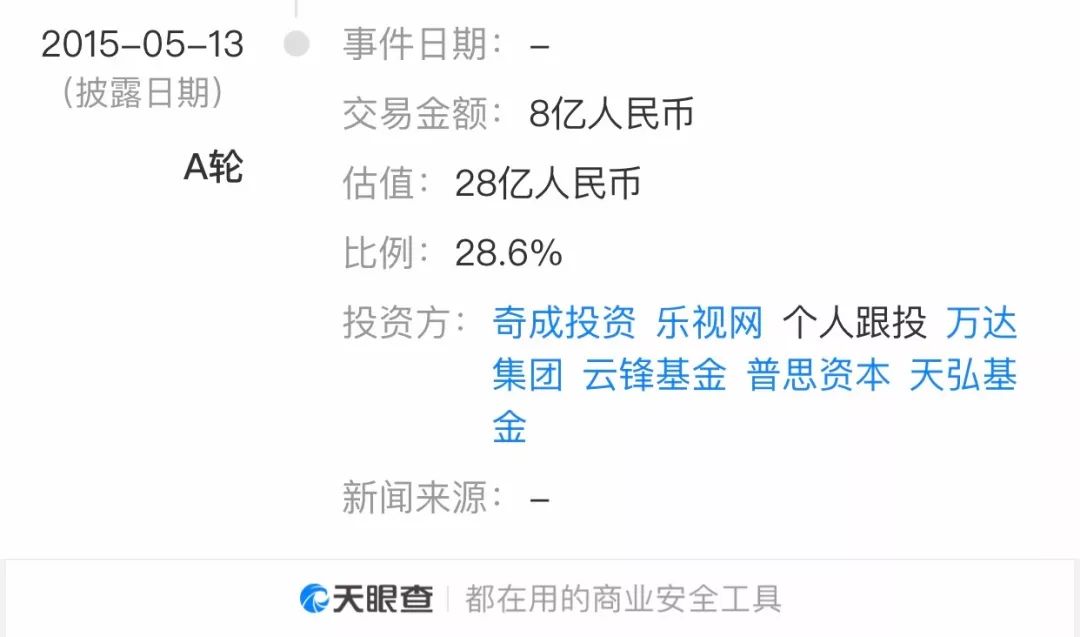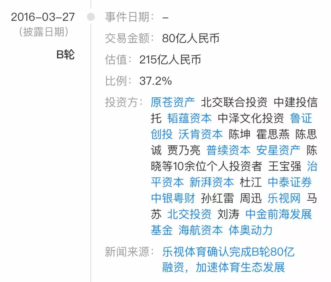 2016年3月,乐视体育再获80亿元B轮融资,投后估值达到215亿元。值得一提的是,此轮融资除了海航资本、中泰证券等一众机构外,还有诸多大牌明星参与其中。