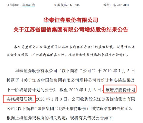 5日晚间,华泰证券公告称,截至2020年1月3日,公司第一大股东江苏国信集团有限公司(简称“国信集团”)完成了最新一次半年期增持计划。