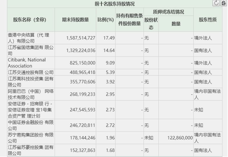 根据华泰证券2019年三季报,除去代持H股非登记股东股份的香港中央结算(代理人)有限公司,以及GDR存托人Citibank, National Association,其余非江苏国资委旗下股东中,持股最多的是阿里巴巴,持股比例不超过3%。