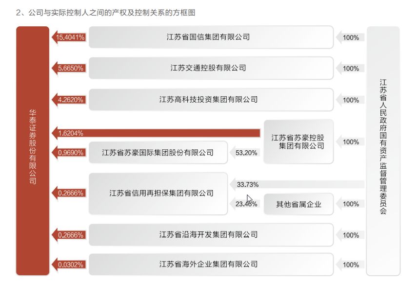 连续两次的股权稀释,不仅使得国信集团的持股比例下降不少,也进一步减少了实际控制人的持股比例。华泰证券2018年年报显示,江苏省人民政府国有资产监督管理委员会(简称“江苏国资委”)通过国信集团、江苏交通控股、江苏高科技投资等公司,合计持有华泰证券27.92%的股权。