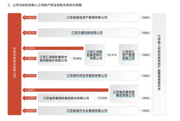 原来,华泰证券近两年相继实施了142亿元定增及GDR发行,截至目前华泰证券的总股本增加至90.77亿股,其第一大股东国信集团,以及实际控制人江苏国资委的持股比例遭到稀释。