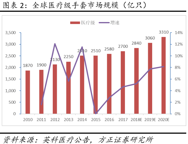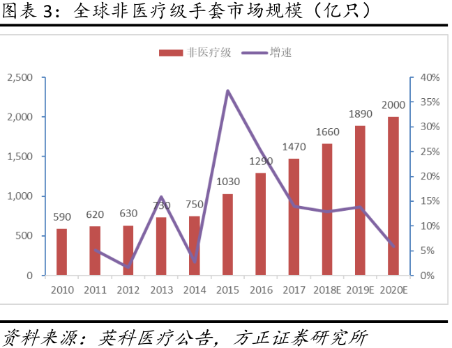 根据中国塑协和马来西亚手套行业协会数据,2019 年度全球医疗级手套市场规模达到3060亿只,非医疗级手套市场规模达到1890亿只,手套行业整体保持 8-10%的稳健增长。鉴于疫情带来防护需求的增长,马来西亚手套协会预计2020 年行业需求增长将上调为 20%左右(HIN1 疫情期间增长约17%),Top Glove(顶级手套)公司首席执行官也预计疫情后行业正常的需求增速由既有的8-10%增至12-15%左右。