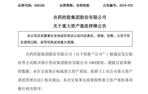吉药控股(300108)7月10日晚间公告,公司拟通过发行股份等方式购买修正药业集团股份有限公司100%股权。本次交易预计构成重大资产重组。公司7月11日起停牌。