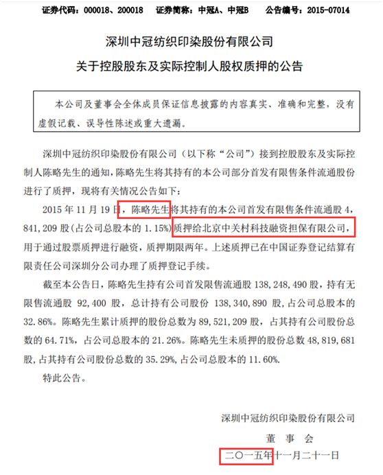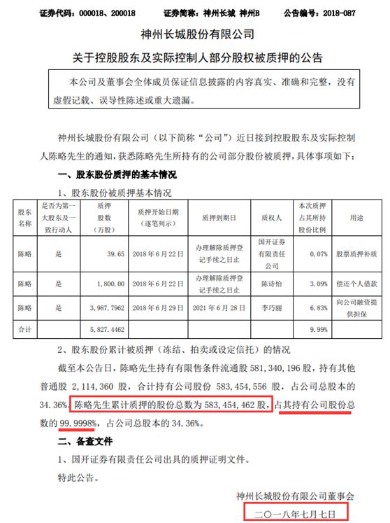 此后,陈略不断加码质押。至2018年7月,陈略已将 583,454,462 股股份进行质押,占其持有公司股份总数的 99.9998%,基本是满仓质押。
