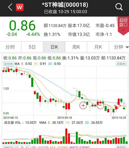 10月29日,*ST神城(000018.SZ)股价全天牢牢封死跌停,收盘报0.86元,这是该股连续第19个交易日低于1元人民币的面值。根据测算,即便下一交易日涨停,其股价也仅为0.90元,仍将低于面值。