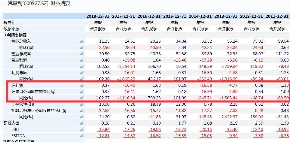 与此同时,企业利润出现大幅跳水并陷入了连年亏损,2013年以来,一汽夏利扣非净利累亏82.33亿元。其中2013年和2014年,一汽夏利分别亏损4.79亿元和16.59亿元,2015年的扣非净利润为-11.82亿元,2016年的扣非净利润为-16.76亿元,同比下降41.86%,2017年继续大亏16.66亿元,2018年亏12.63亿元。