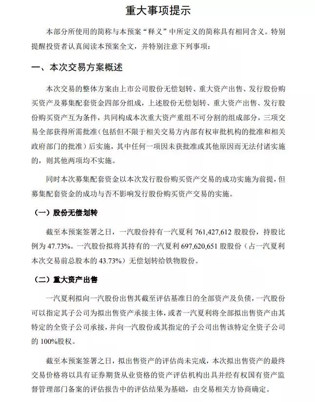 一汽股份拟将其持有的上市公司6.97亿股股份,占一汽夏利本次交易前总股本的43.73%,无偿划转至中国铁路物资股份有限公司(以下简称“铁物股份”)。