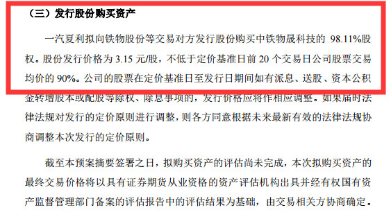 一汽夏利拟向铁物股份等交易对方发行股份购买中中铁物晟科技发展有限公司(以下简称“中铁物晟”)的98.11%股权,股份发行价格为3.15元/股。