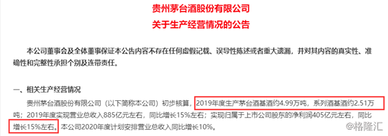 1月2日早间,贵州茅台发布关于2019年生产经营情况的公告。该公告显示,经初步核算,2019年,贵州茅台生产茅台酒基酒约4.99万吨,系列酒基酒约2.51万吨。