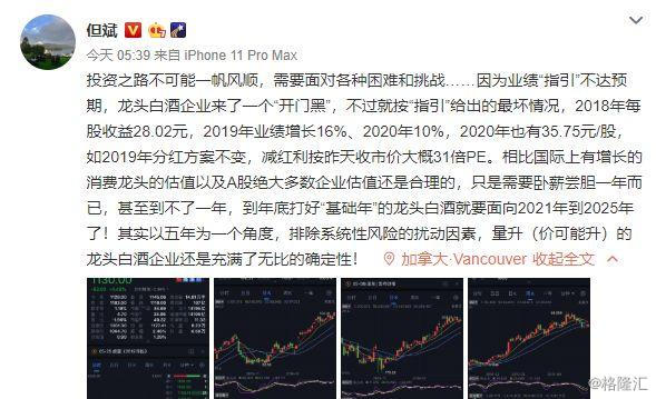 一直关注并投资茅台的私募大佬但斌也在其微博中力挺道:“龙头白酒所谓‘业绩’不达预期,开门黑,成交量巨大,估计国内基金和投资者跑路的多,其实1年、2年的业绩很难说,但放到五年就知道该怎么做了。国外基金的五年考核期是非常有道理的!”