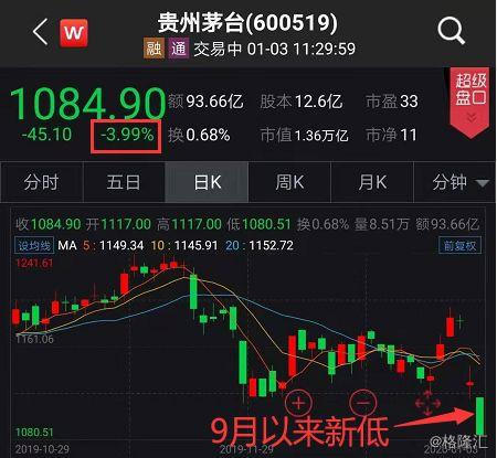 1月3日早盘,贵州茅台延续昨日跌势,跌破1100元,刷新2019年9月以来新低。