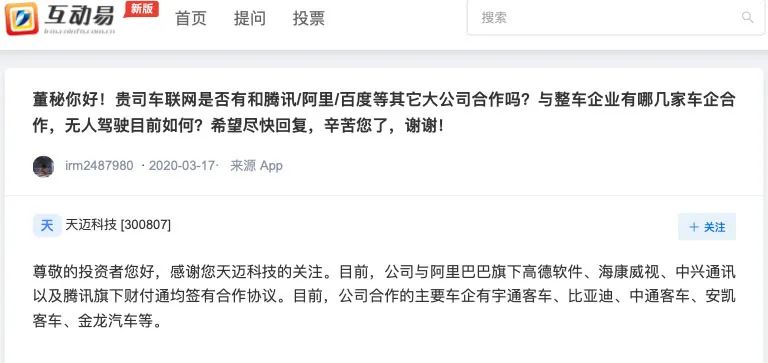 除此之外,公司还在互动平台上表示,与阿里巴巴旗下的高德软件签有合作协议,合作的车企主要有宇通客车、比亚迪、中通客车、安凯客车、金龙客车等。