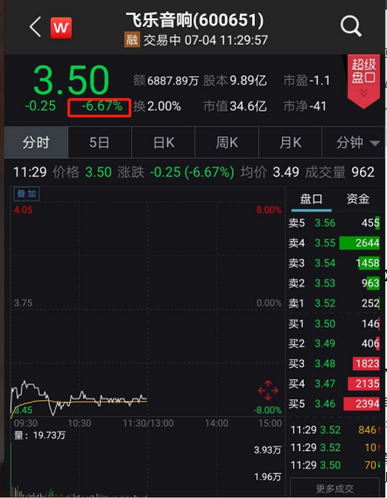 7月4日开盘,飞乐音响股票大跌8.8%,股价最低触及3.4元。截至午间收盘,飞乐音响股价为3.50元,跌幅6.67%。