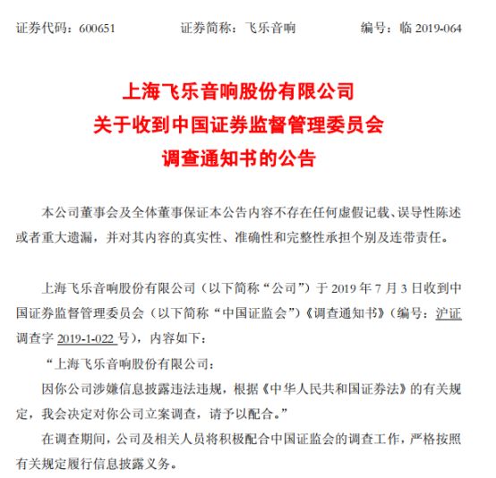 7月3日晚间,飞乐音响发布公告称,收到证监会调查通知书,因公司涉嫌信息披露违法违规,证监会决定对公司立案调查。