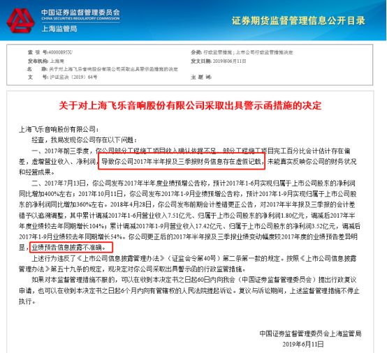 6月11日,上海证监局向飞乐音响发出一份罚单。上述罚单指出,公司在2017年的部分施工项目收入确认中存在虚增营业收入及净利的情况,导致当年的半年报和三季报业绩出现“变脸”。因业绩信息披露不准确,以及财务信息虚假记载等情况,违反相关规定,上海证监局决定对飞乐音响出具警示函的行政监管措施。