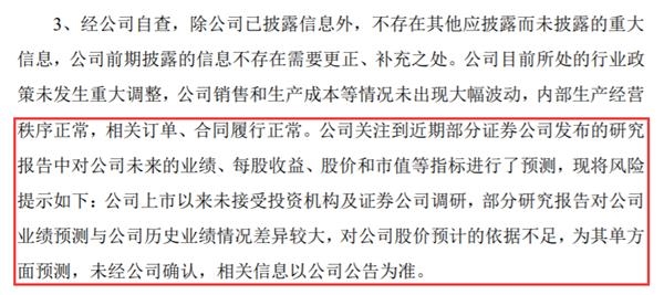 公司上市以来未接受投资机构及证券公司调研,部分研究报告对公司业绩预测与公司历史业绩情况差异较大,对公司股价预计的依据不足,为其单方面预测,未经公司确认,相关信息以公司公告为准。