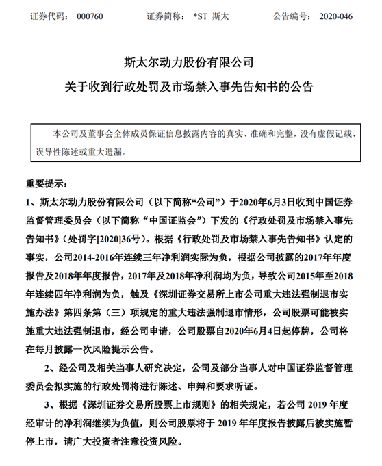 6月3日晚间,*ST斯太发布公告称收到证监会下发的行政处罚及市场禁入事先告知书。告知书认定,公司2014-2016年连续三年净利润实际为负,另据财报,公司2017年及2018年净利润均为负,导致公司2015年至2018年连续四年净利润为负,触及重大违法强制退市情形,公司股票可能被实施重大违法强制退市。公司股票将于6月4日起停牌。公司及部分当事人对拟实施的行政处罚将进行陈述、申辩和要求听证。