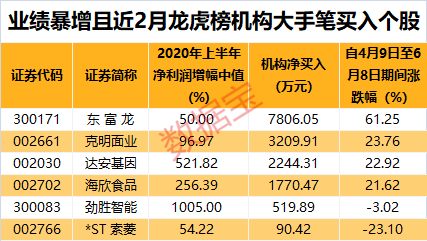 在65只2020年上半年大幅增长(增幅在五成及以上)的个股中,自4月9日至6月8日期间机构净买入的仅有6只,其中净买入金额最大的个股有:东富龙上半年净利润增长50.00%,机构净买入7806.05万元;克明面业净利润增长96.97%,龙虎榜机构资金净流入3209.91万元;达安基因业绩同比增长521.82%,机构净买入2244.31万元。另外,机构青睐的绩优个股自4月9日至6月8日期间市场表现不俗,东富龙涨幅达60.77%,跑赢大盘57.06%,海欣食品上涨31.74%,超过大盘28.03%。
