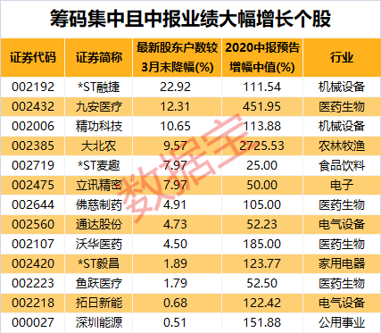 业绩预增股不仅获机构龙虎榜资金的看好,同时筹码也大幅集中。数据宝统计显示,截至最新收盘日,与一季末相比,股东户数降幅超过5%且中报净利润增幅中值超过20%的个股仅有6只。包括*ST融捷、九安医疗、精工科技、大北农等,前3股筹码集中度超过10%,*ST融捷中报业绩有望扭亏,九安医疗中报净利润增幅中值超过450%。