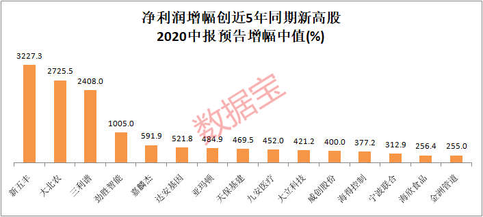 其中增幅超过10倍的公司仅有4家,净利润同比翻倍且在10倍以下的达36家,增幅在五成以上100%以下的个股为25家。具体来看,2020年上半年业绩增长率居前的公司有新五丰、大北农、三利谱及劲胜智能,净利润同比增幅分别为3227.32%、2725.53%、2408.02%及1005%。嘉麟杰、达安基因、亚玛顿、天保基建等股今年上半年净利润增幅均超过450%。